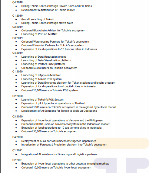 Tokoin’s platform issues TOKO on the blockchain as a means of interaction between participants. TOKO is used as an incentive when a participant in the ecosystem submits transaction data and validates the data. Also, it is a prequisite for using certain services on TOKO’s platform, including the business insights service provided by Tokoin. For service providers, TOKO is used for accessing advertisements and transaction data of MSMEs. With more and more participants using Tokoin’s services, the participants will have to stake and/or use the Tokens to use Tokoin’s platform, and this later raises the price of TOKO.